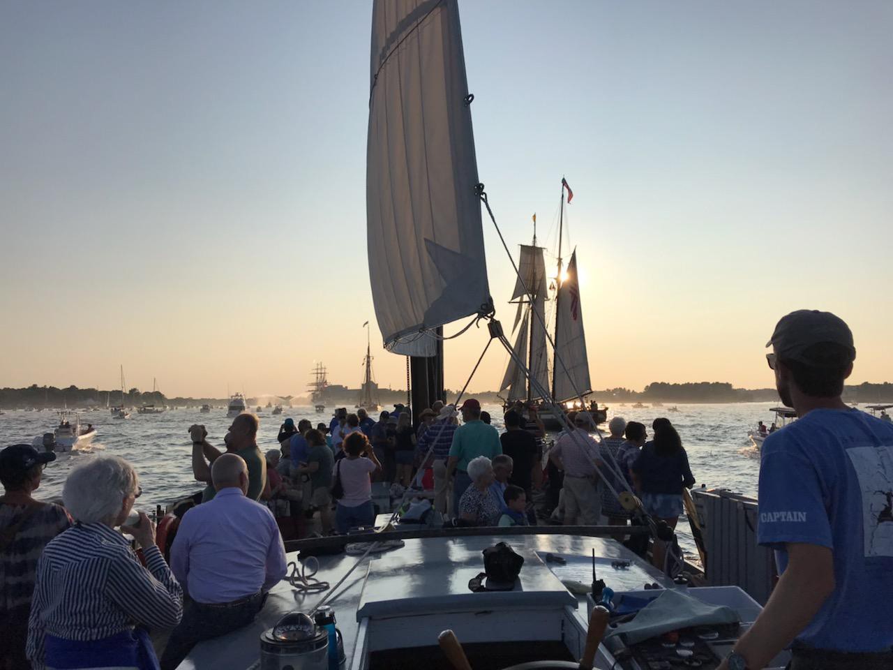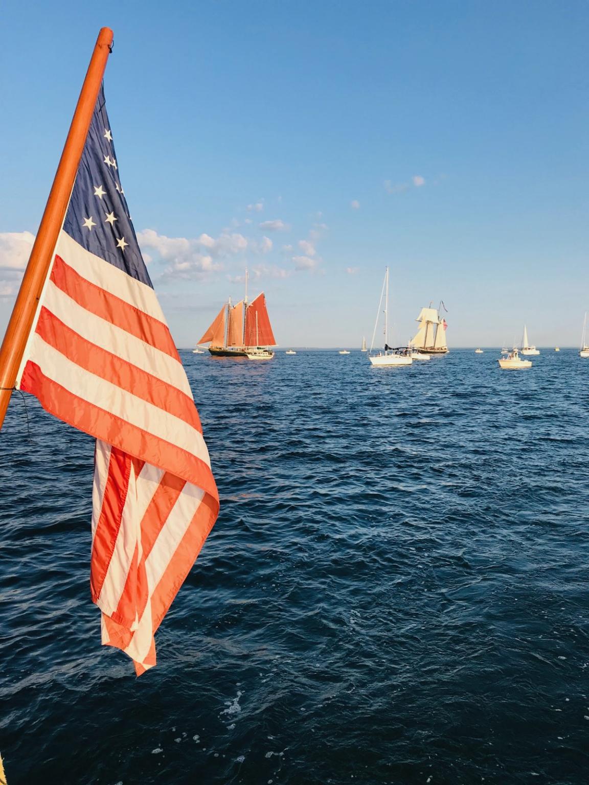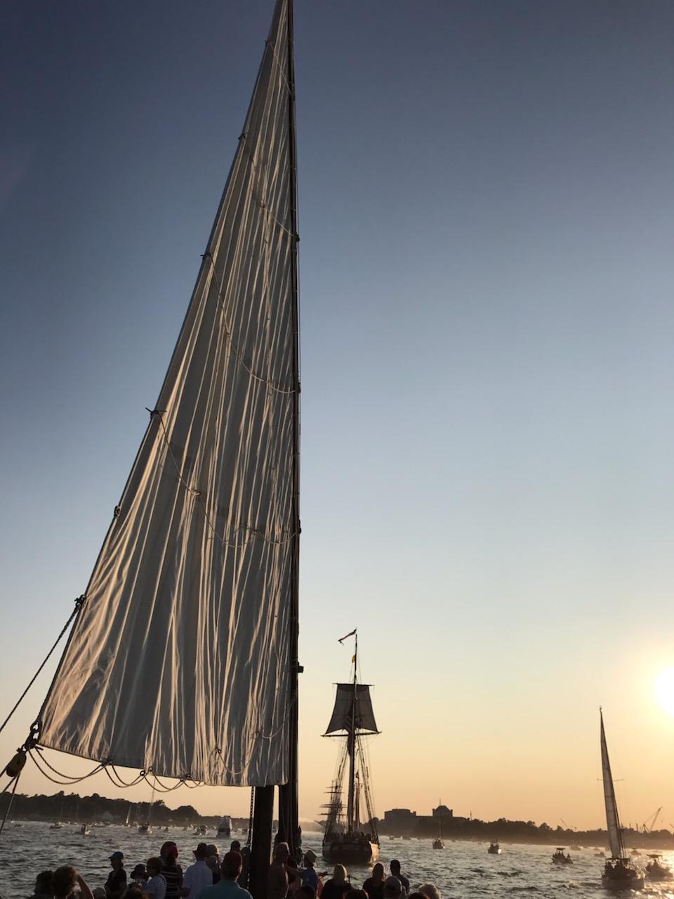 As we gathered in the harbor along with the U.S. Coast Guard Cutter Eagle, the Linx, and the Roseway we were greeted with a U.S. Navy fireboat official welcome water spray! With dusk approaching we seamlessly slipped into line with the other tall ships and began our sail into Portsmouth. Boats passing by and viewers on land were waving as we sailed by. We laughed as we practiced our parade wave back.