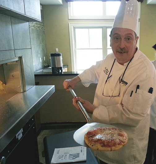 Executive Chef (of twenty years!) in front of a dining room of residents.